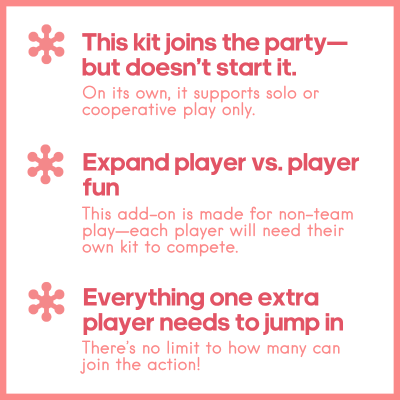Want to expand the player-vs-player fun? The CARGOGO Add-On is made for non-team play—each player will need their own kit to compete. There’s no limit to how many can join the action! This add-on includes everything one extra player needs to jump in. (Please note: this kit is intended as an add-on—on its own, it supports solo or cooperative play only.) Recommended for ages 4–94.